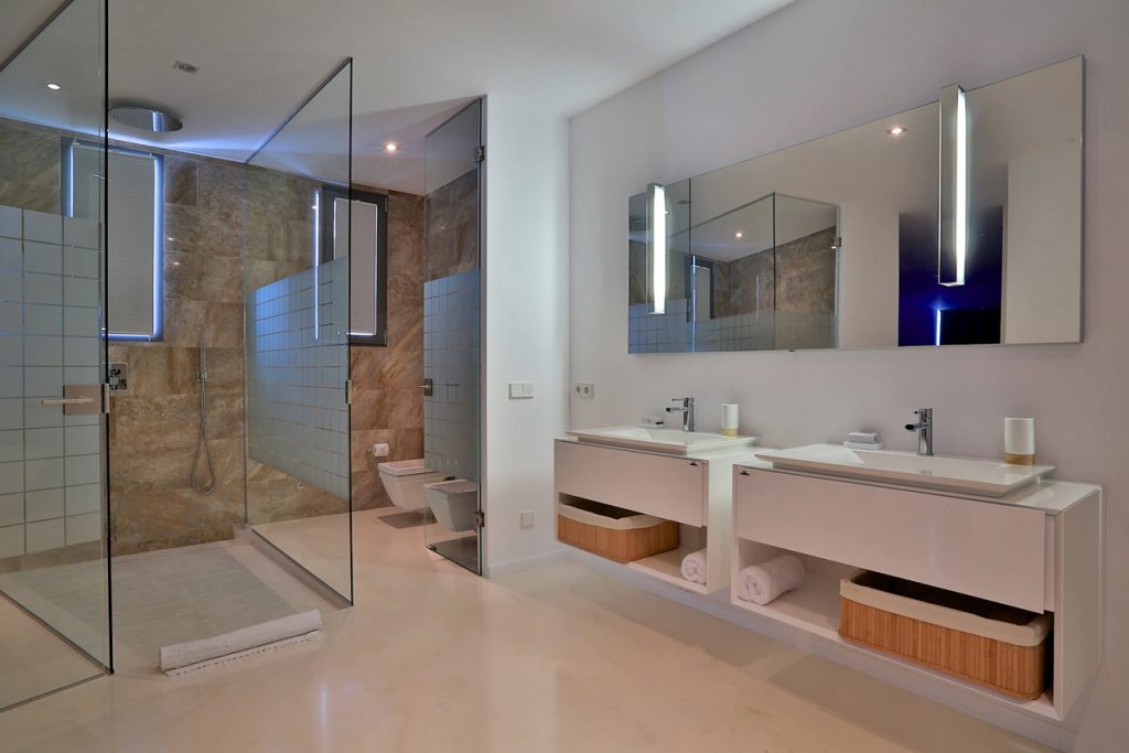 There are five luxurious bedrooms furnished to the highest standard, all with en suite bathrooms. The master suite takes up the whole of the top floor and consists of a double bathroom, a fitted dressing room, private terrace and outdoor sitting area. There are in addition three huge guest suites with private bathrooms. The fifth bedroom is on the lower floor, and enjoys a private bathroom and direct access from outside.