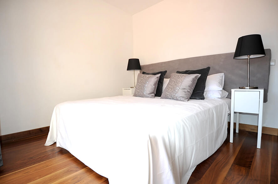 The property’s ground floor comprises a lounge furnished to an incredibly high standard—with large sofas, a coffee table, indoor dining table, plasma satellite TV and a B&O sound system. There is also one bedroom, complete with king size bed and en suite bathroom with double sinks and shower. This bedroom also enjoys direct garden access and has a sea view.