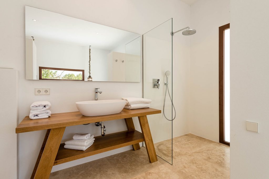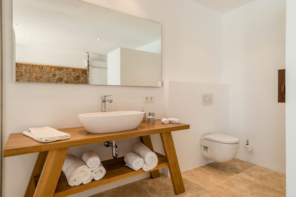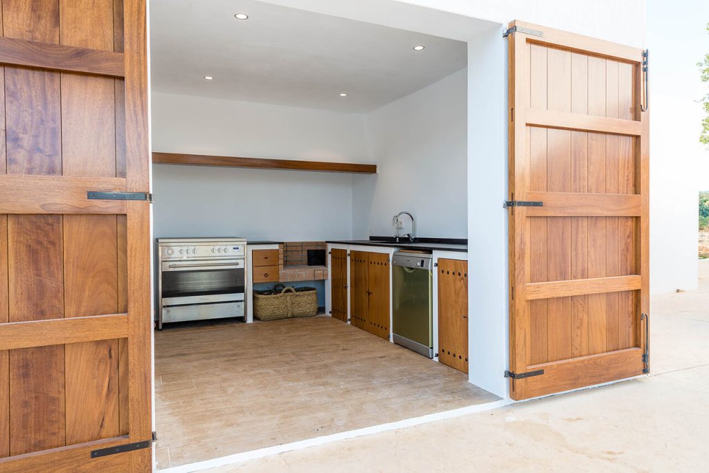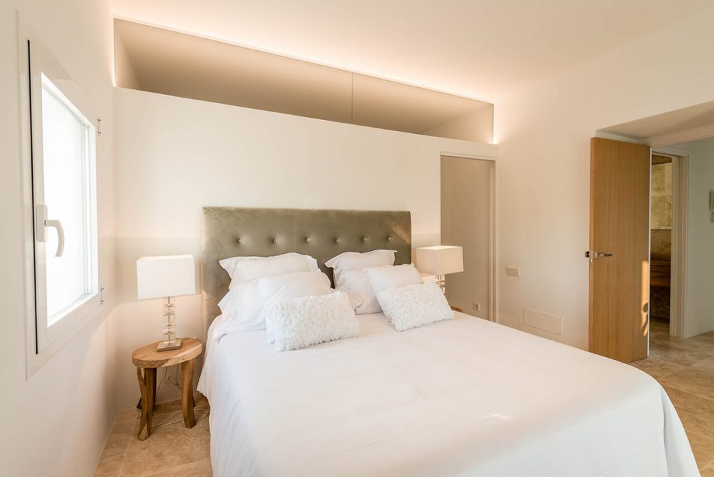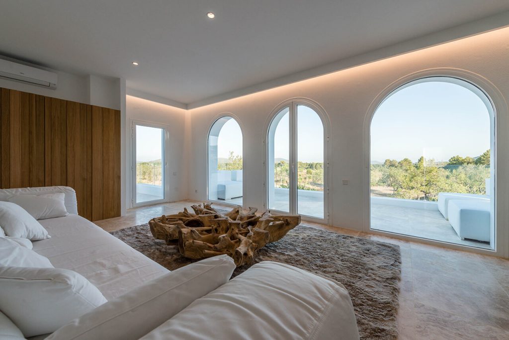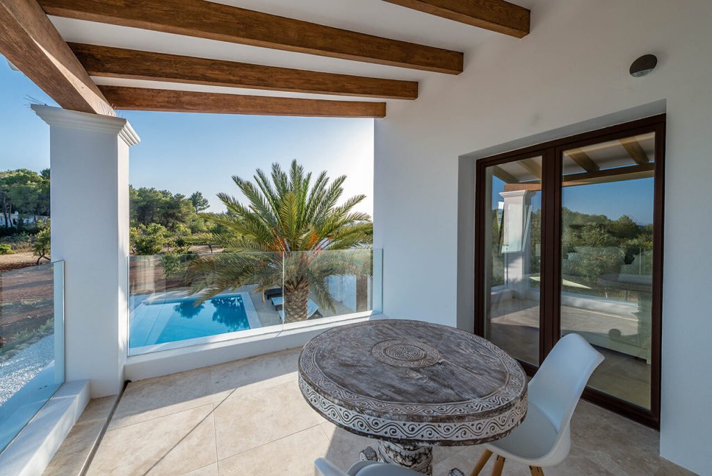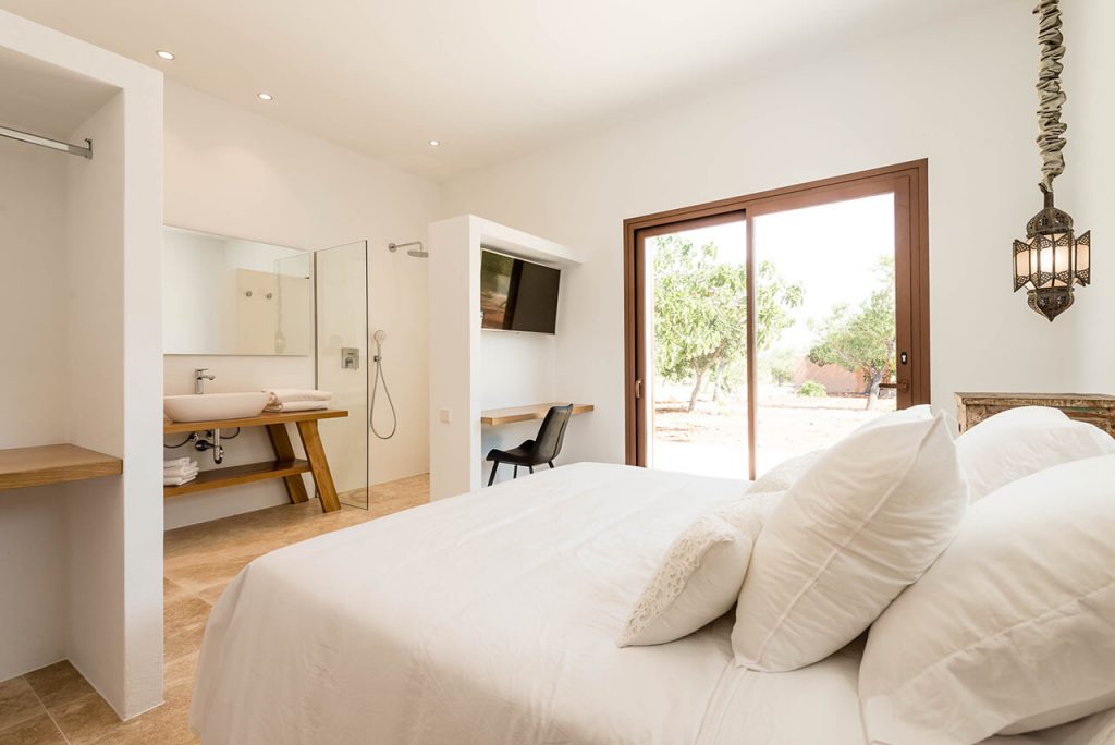 Outside, two annexes are situated around a beautiful salt-water pool (10m x 6m), complete with sun loungers and parasols – which in turn is situated exactly to make the most of the property’s gorgeous setting within the Ibizan hills.