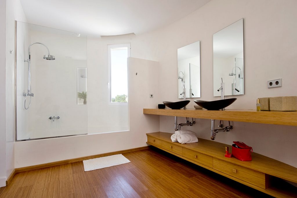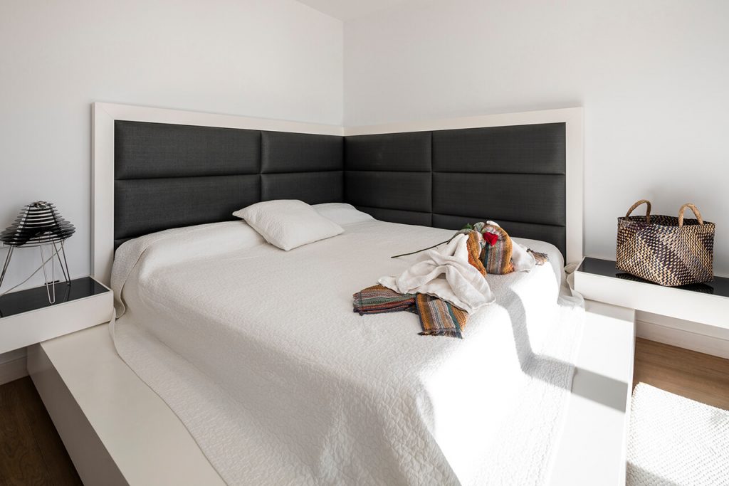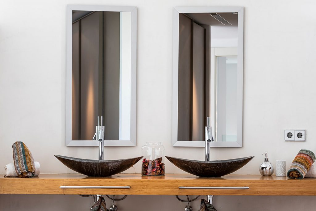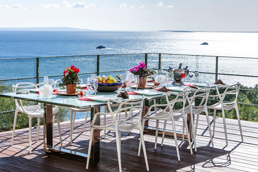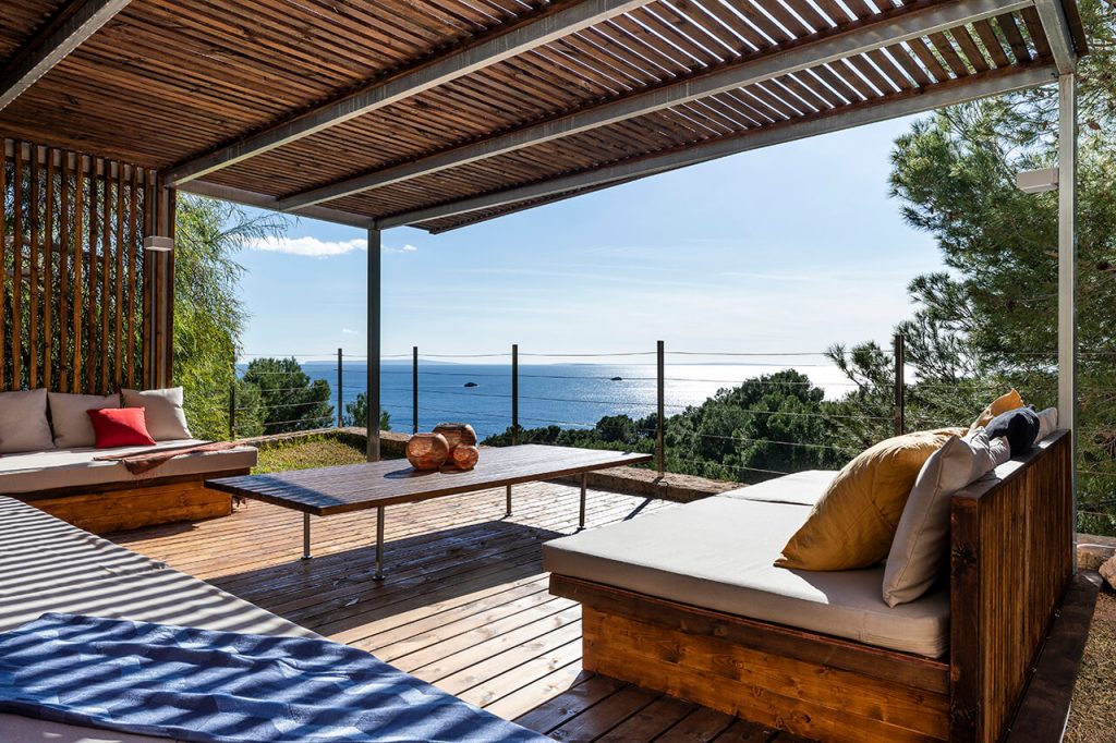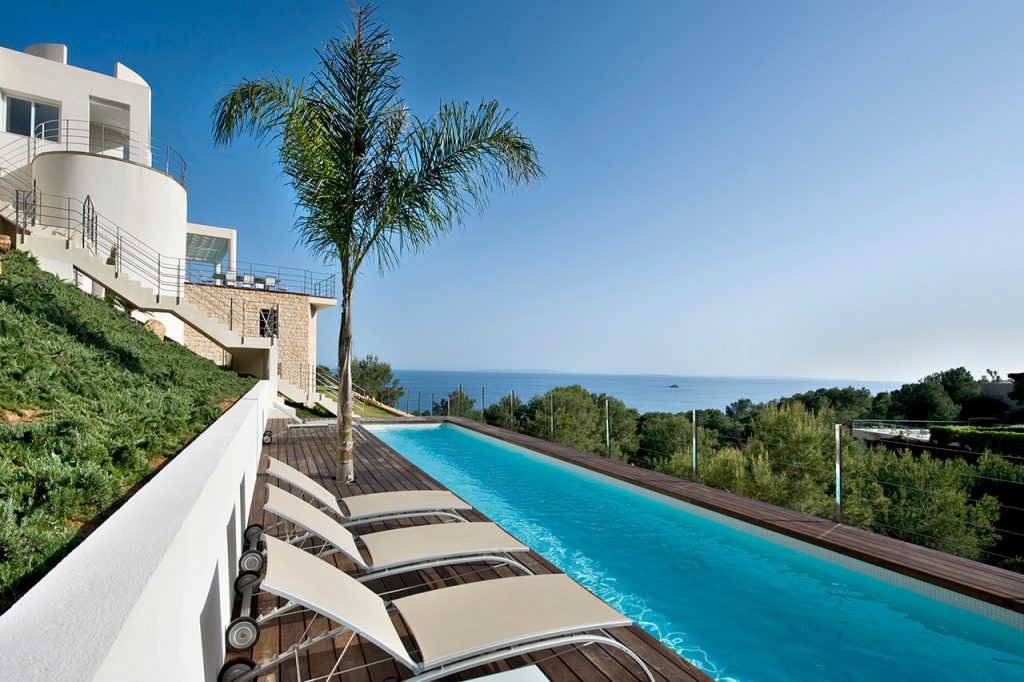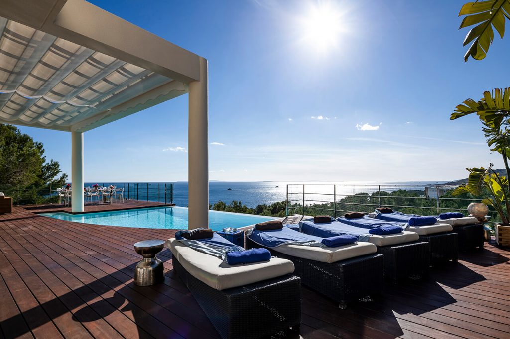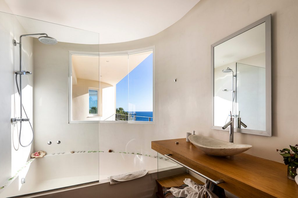 In the main house overlooking the sea there are four beautiful double bedrooms, each with a balcony, en suite bathroom, dressing room, flat screen TV and satellite TV. The guest house (45 square metres), meanwhile, has a private terrace and offers its occupants a spectacular view of the sea. It consists of a double bedroom with bathroom (shower and toilet), kitchen with bar, dressing room and lounge with 360º swivel-TV swivel – allowing you to watch from the bedroom or lounge.
