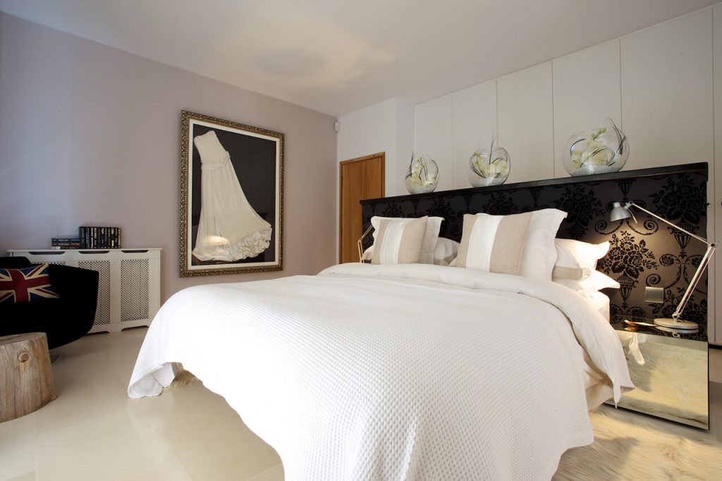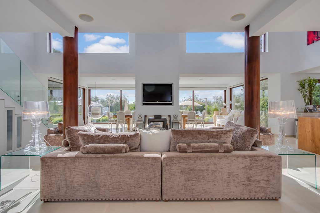 The large floor-to-ceiling glass doors open out onto the pool and garden, where there are giant lounge-style settees and a large, solid oak fourteen-person dining table. The grounds and outdoor facilities in this villa are equally as opulent and well presented as the interior. The pristinely maintained gardens include a beautiful fruit orchard and a magical children’s play area with fishing boat house, swings and a sunken trampoline.