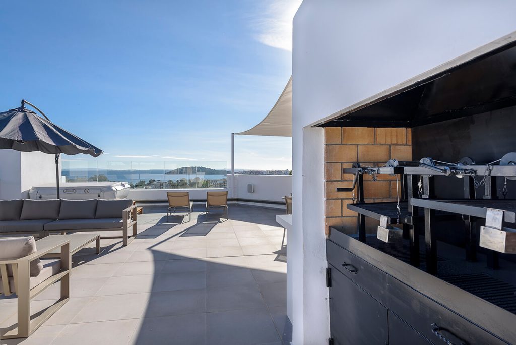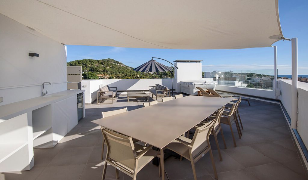 There is a large outdoor dining area seating ten people, incorporating a comfortable outdoor seating area, and a spacious chill-out area beside the pool and a roof terrace. Private gates lead to a car parking area large enough for several cars.