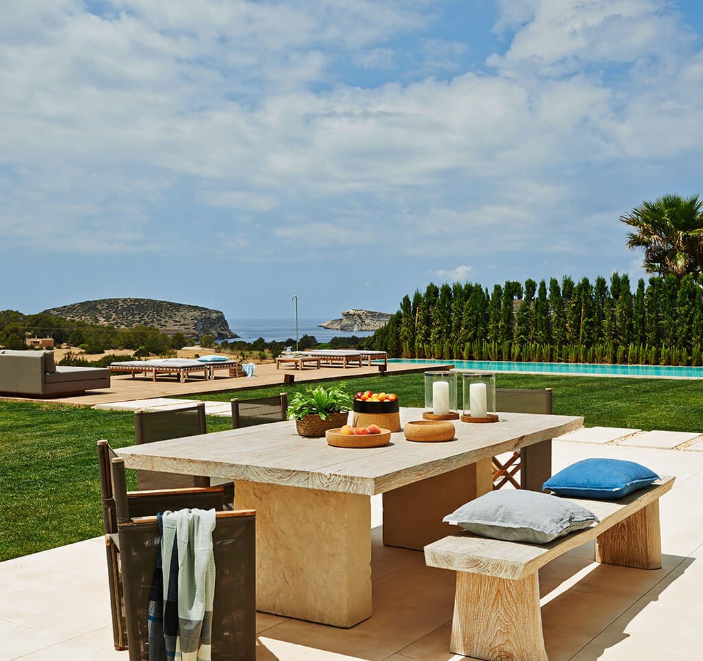 Cala Conta Dream enjoys an ideal location for enjoying Ibiza’s famous sunsets and exploring the local coves and beaches. From the sun-drenched poolside terrace, there are panoramic views across fields to the sparkling Mediterranean Sea and the little islands of Illa des Bosc and Conejera.