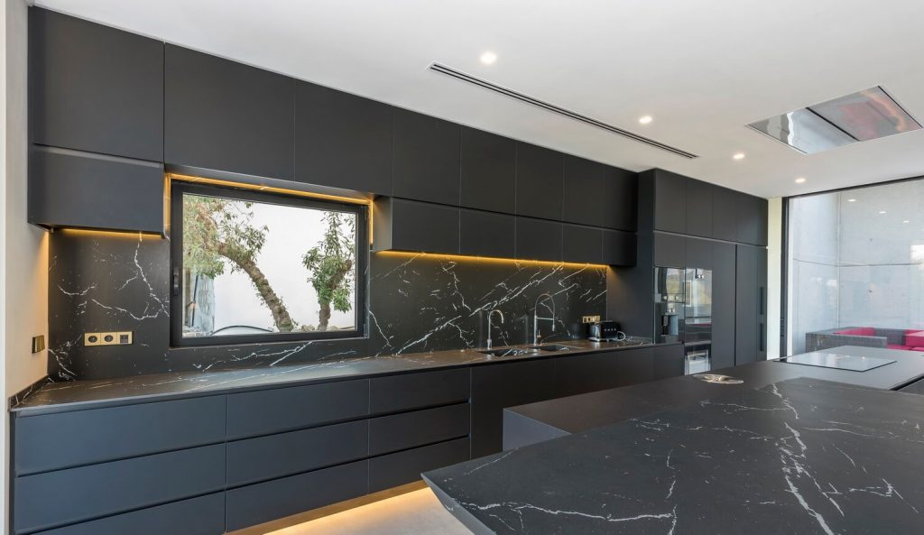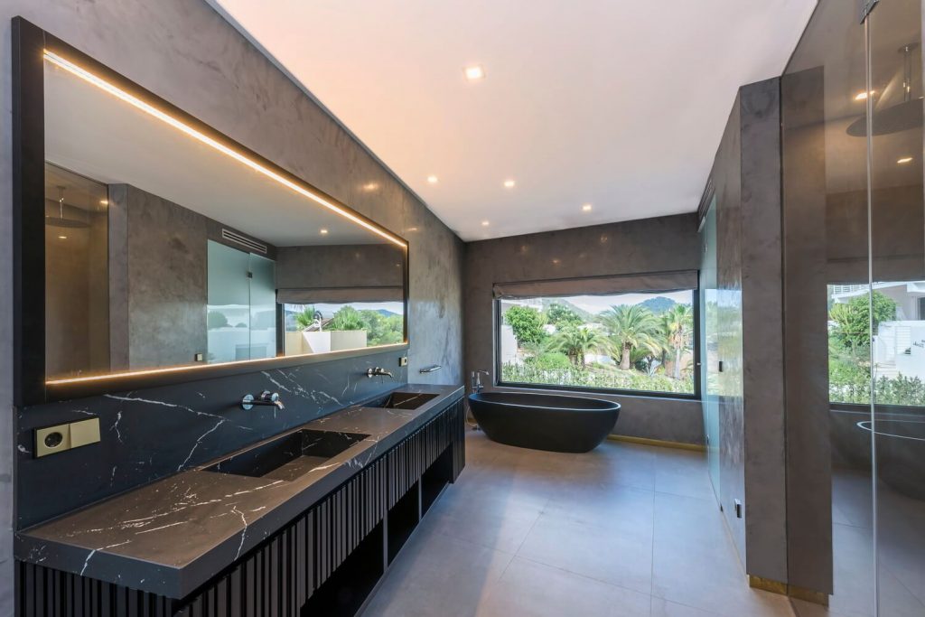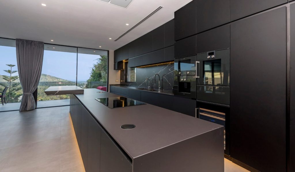 In the kitchen, black marble work surfaces contribute to a space that feels simultaneously attractive and practical. Outside, residents can relax in a superb space featuring loungers, a pool and further remarkable vistas to Dalt Vila.