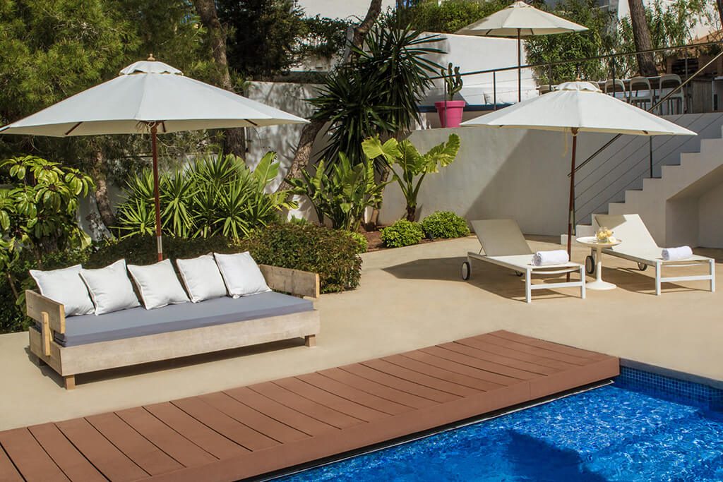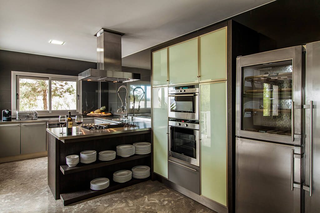 The dining room, with a Poliform design dining suite, leads to an outside covered terrace with two armchairs perfect for quiet reading or enjoying sunset cocktails. The other side leads to a stainless steel kitchen which is equipped with industrial restaurant quality appliances.