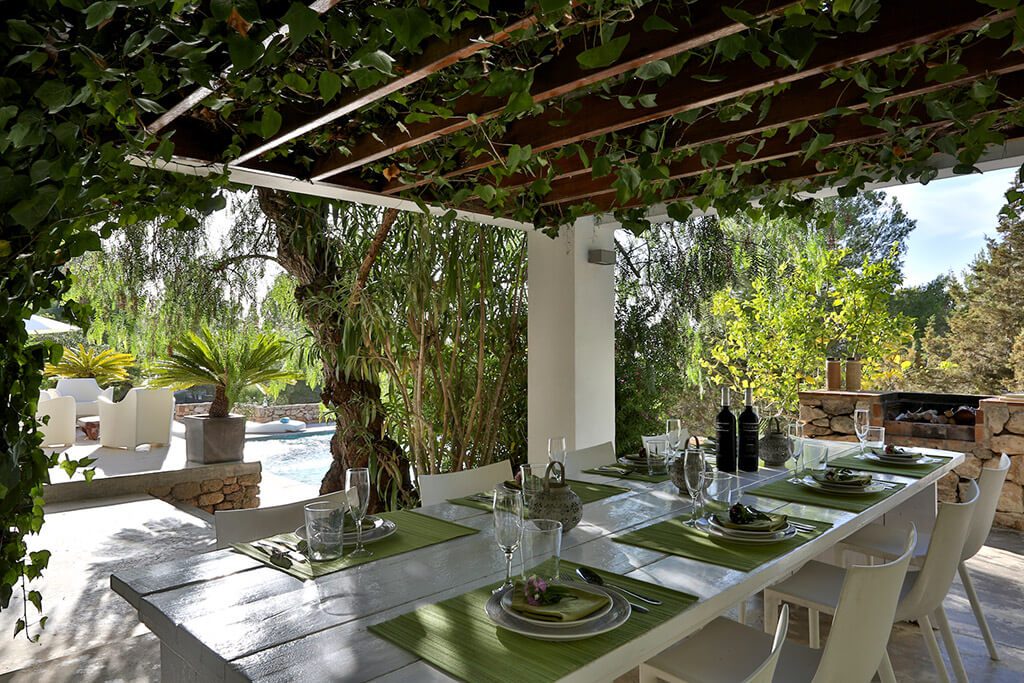 Cascading levels of terraces offer a variety of chill-out spaces where you can soak up the glorious Ibizan sunshine. On the upper layer of terrace, vines twist through a shaded pergola to create a cool outside dining space and barbeque area.