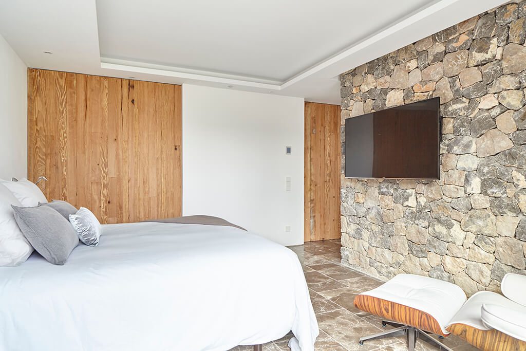 In the main living area, the comfortable lounge space is furnished with beautiful sofas and stone accents on the feature wall. A floor-to-ceiling window offers uninterrupted countryside views. The fully-equipped kitchen and dining areas accentuate that luxe-rustic feel, and offer all the facilities one could require for eating and entertaining.