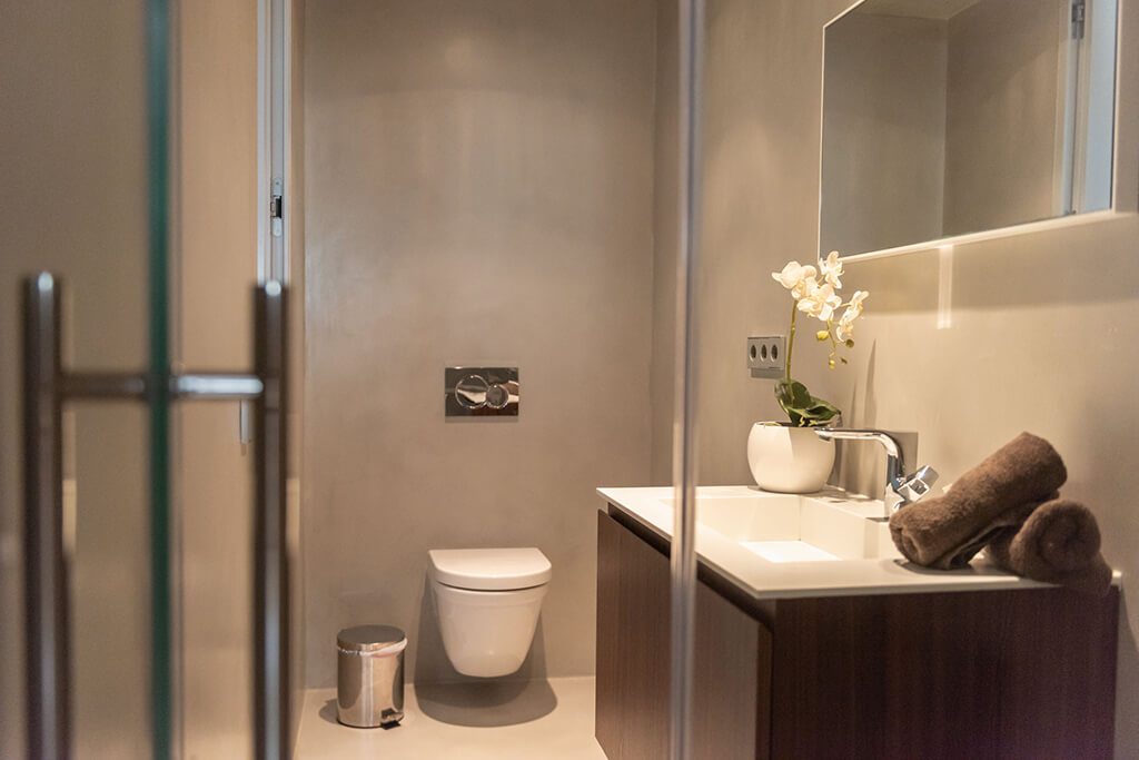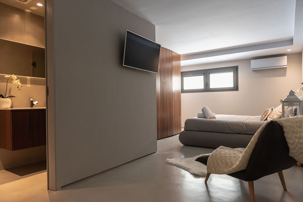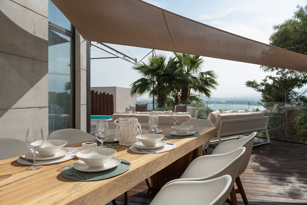 The large infinity pool is surrounded by a spacious, wrap-around sun terrace facing the coast, offering guests complete relaxation in day long sunshine. The pool area includes luxury sun-loungers, outdoor shower, and motorised shading to allow for all-day poolside tanning, or a cooling al-fresco dining space.