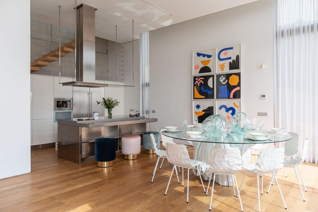 The middle floor offers a brilliant open plan layout with a vast living area that seamlessly links the dining area, modern kitchen and breakfast bar. The high-ceilinged, open-plan living area is beautifully styled and offers a stunning lounge with large sofas, easy chairs, dining table and modern kitchen.