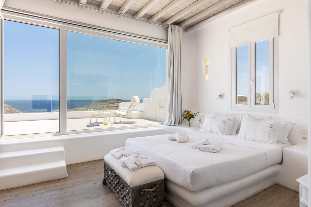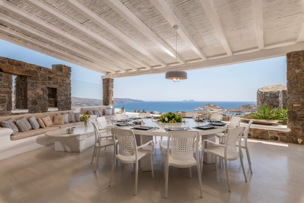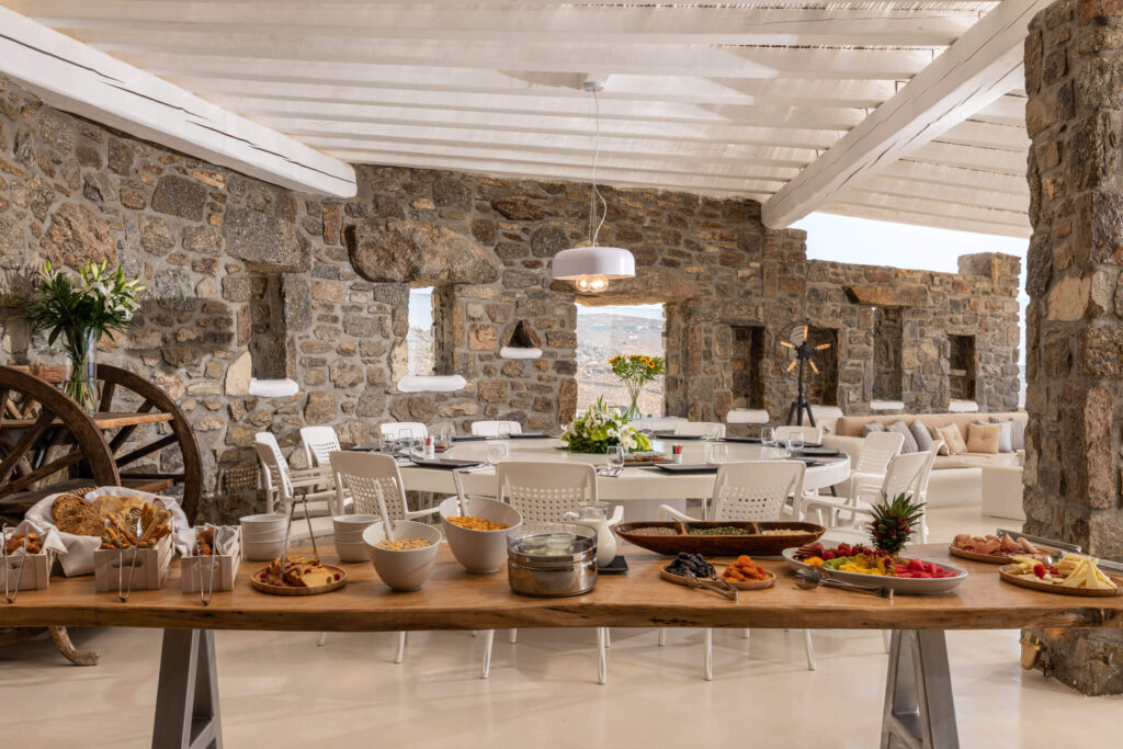 Indoors the estate is characterized by luxury, functionality and spaciousness. The architecture lines are typical Cycladic with white washed walls that blend harmoniously with white furniture, light colored wood and various colorful decorating details.