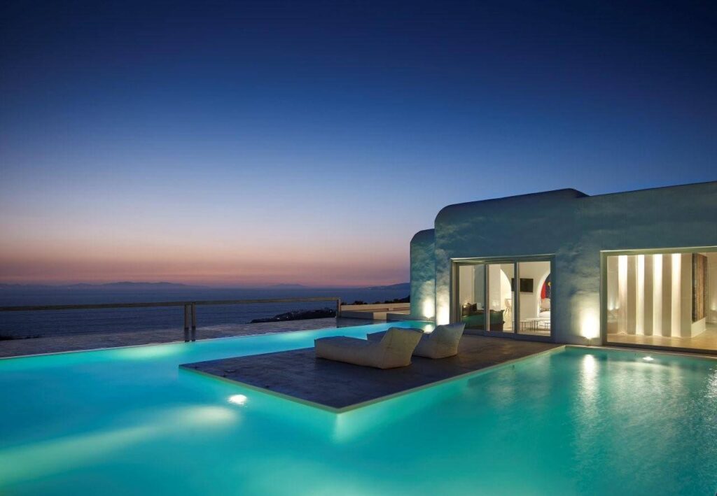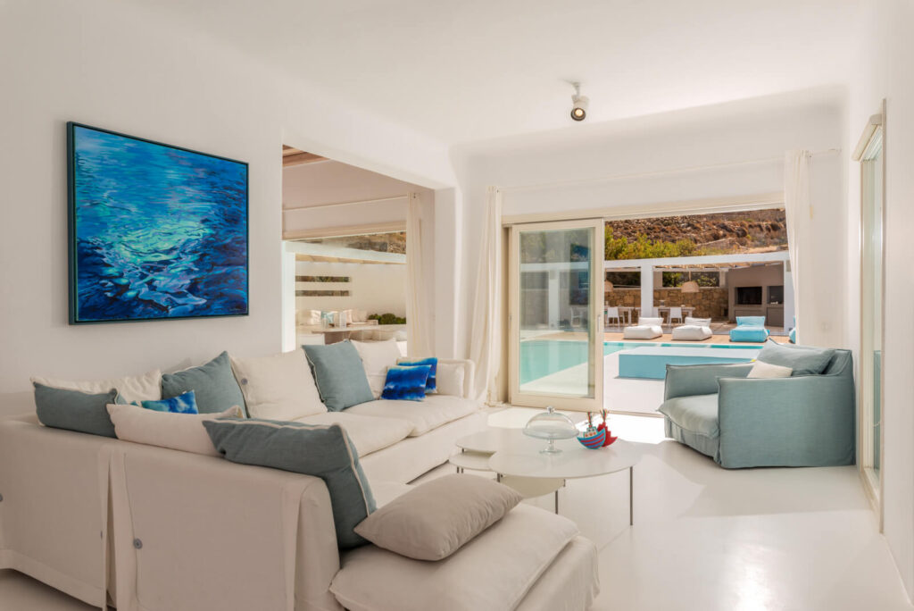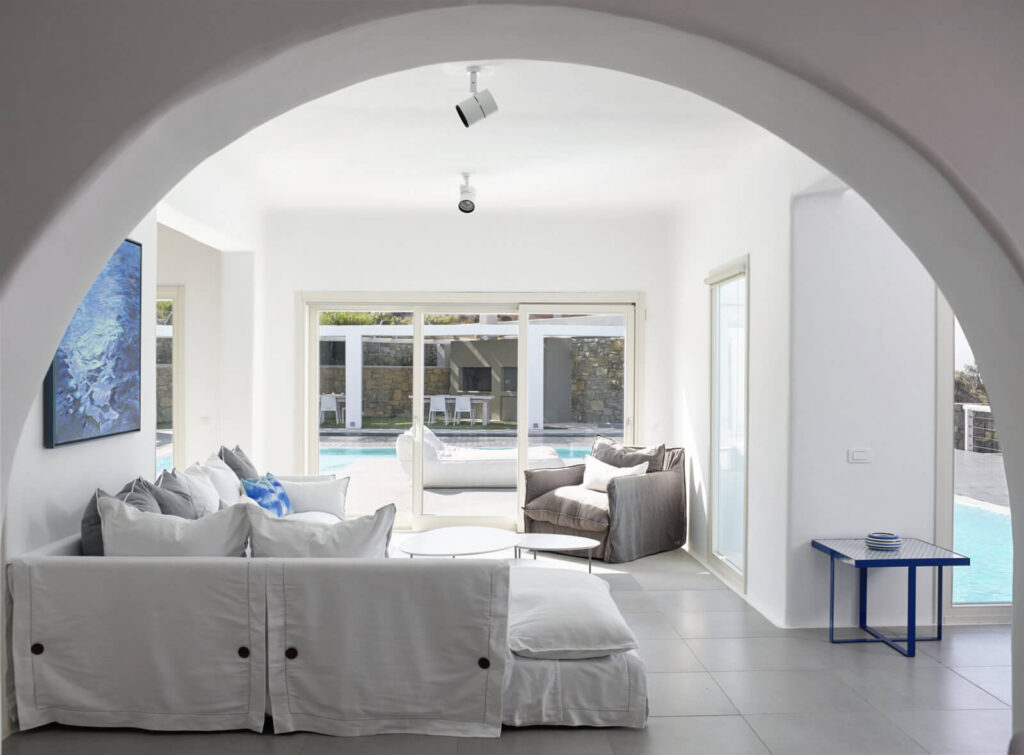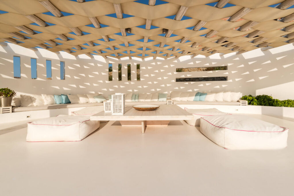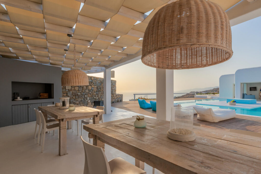 The exteriors are impeccably designed in a Mykonian architectural line. White washed walls, cubic shapes and natural materials like stone and wood, uniquely reflect the minimalistic splendour of Cycladic architecture. The lavish outdoor space features an inviting swimming pool with glistening turquoise waters, a pergola-shaded dining area, and stylish seating areas that offer astounding views across the endless blue horizon.
