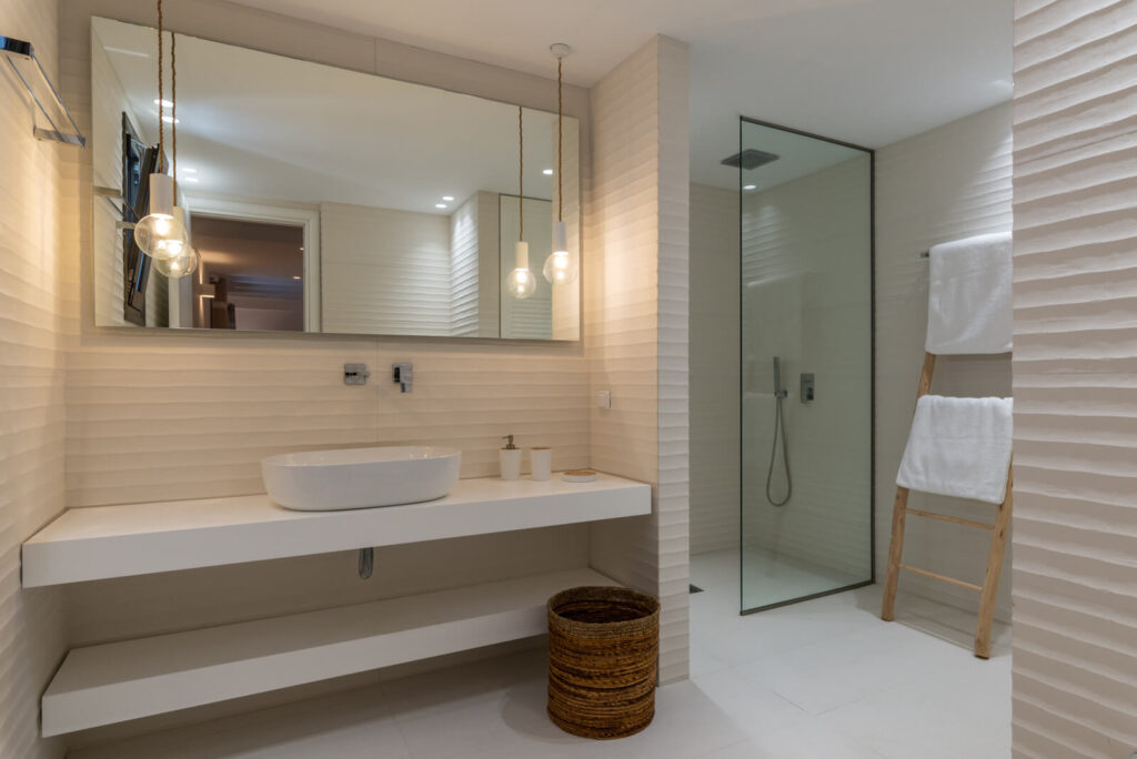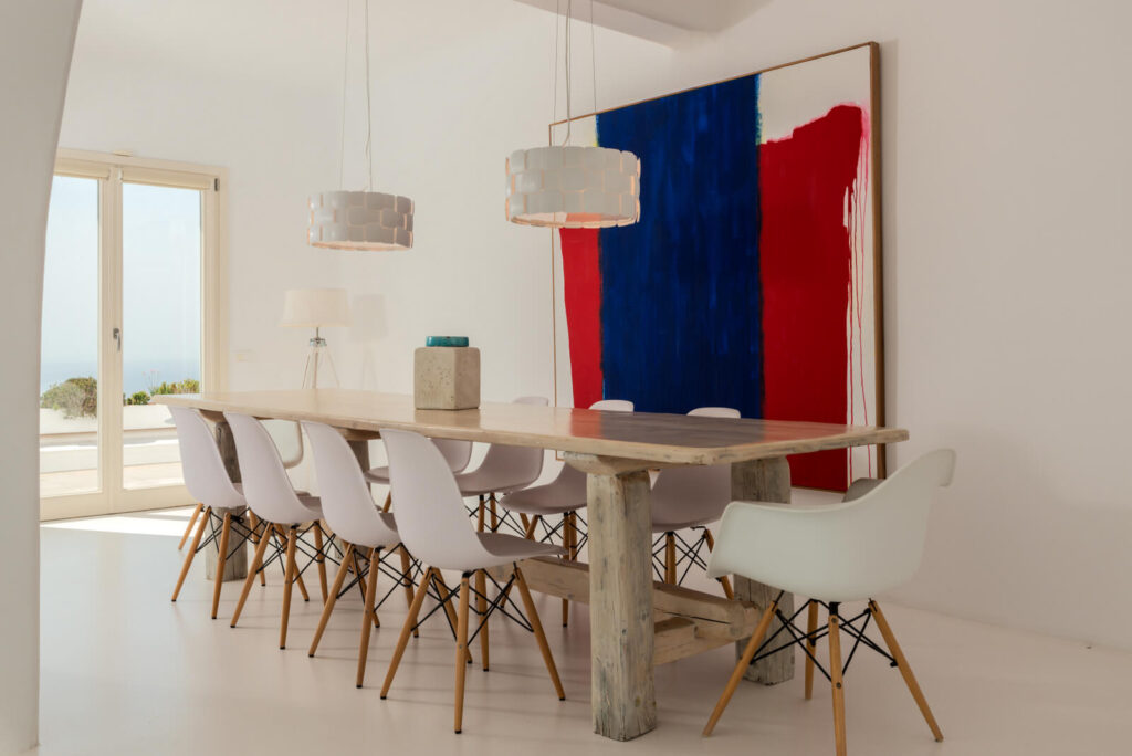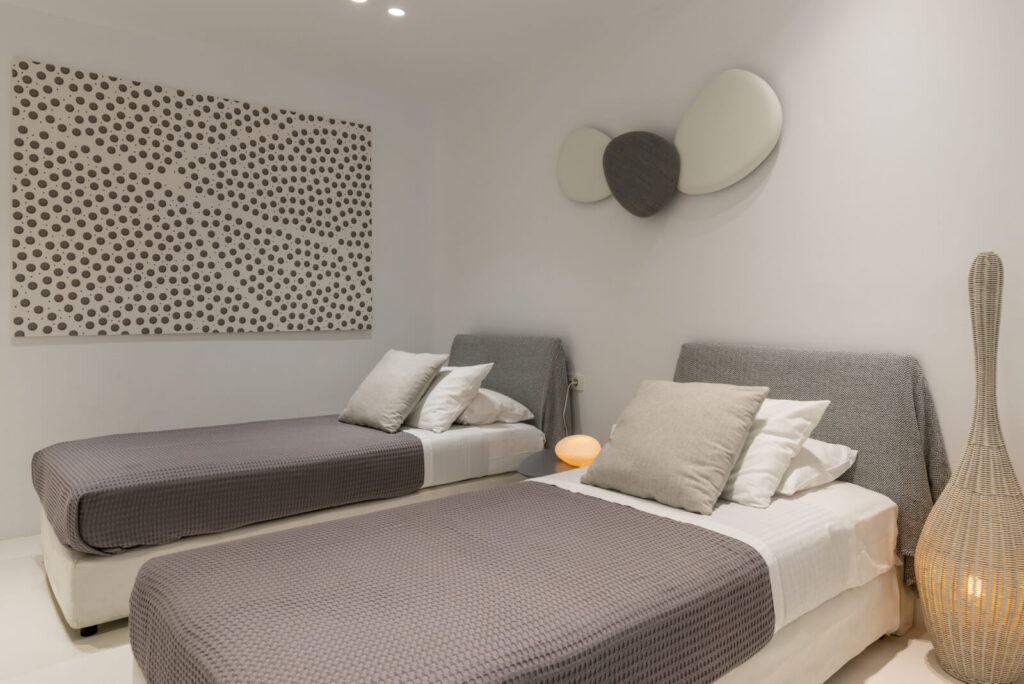 The striking interior design is a fusion of modern and authentic island style. The bright walls and white-washed furniture, are enhanced by various soft, earthy colors, creating a gentle backdrop for the azure decorative elements.