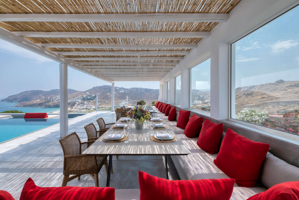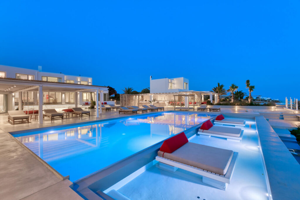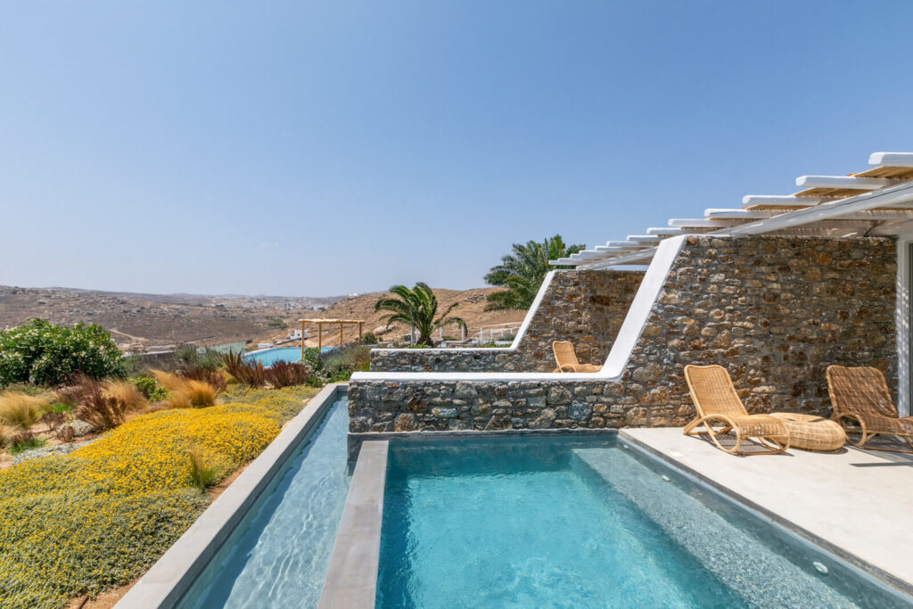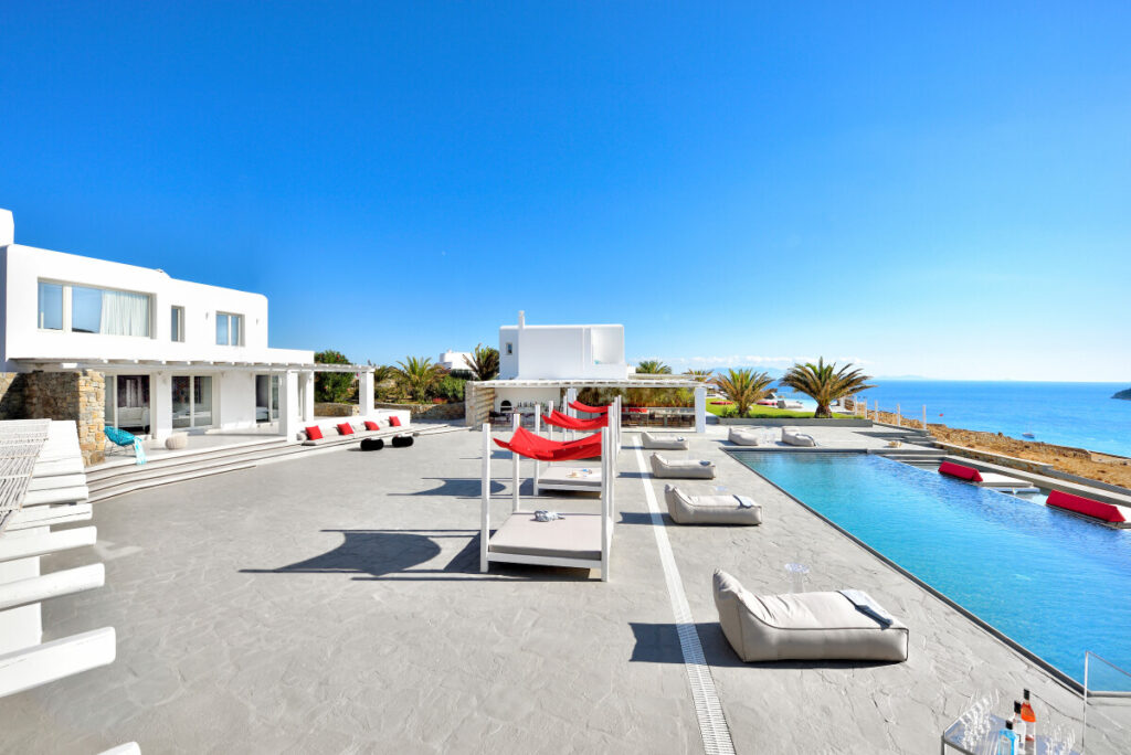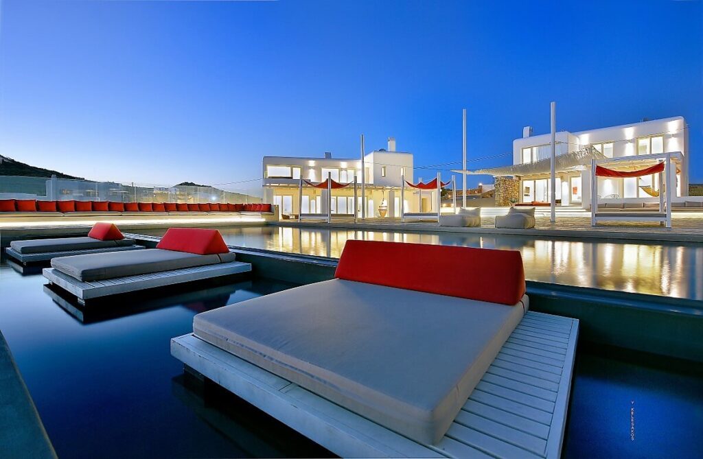 The spectacular terrace embodies quintessential Mykonian lifestyle, providing plentiful space to entertain any type of private event. Fitted with comfy dip-in water day beds, the two pools are exquisite and directly face an expanse of deep Aegean blue.
